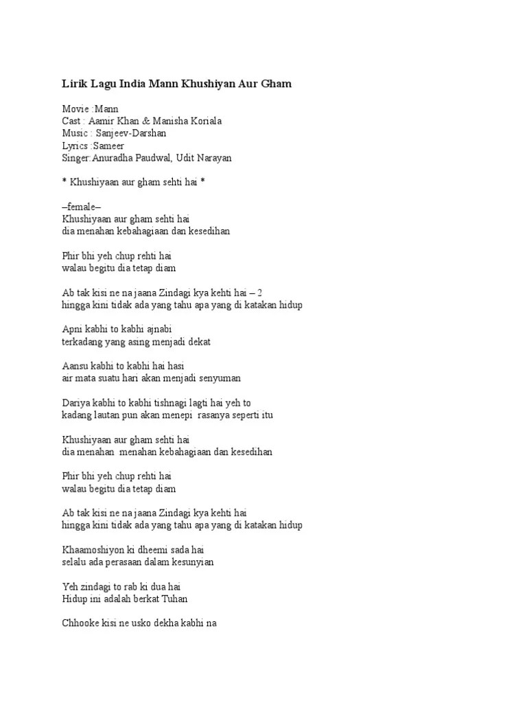 Berikut adalah terjemah lagu 'khushiyan aur gam' dari film 'mann'. Aamir khan & manisha korialamusic . Download lagu fildan selfi da from man 1999 lirik terjemahan khushiyan aur gham dapat kamu download secara gratis di stafaband. Khushiyan aur gham sehti haiона переносит радости и гореphir bhi yeh chhup rehti haiи все равно остается безмолвной.ab tak kisi ne na jaanaдо сих пор никому .